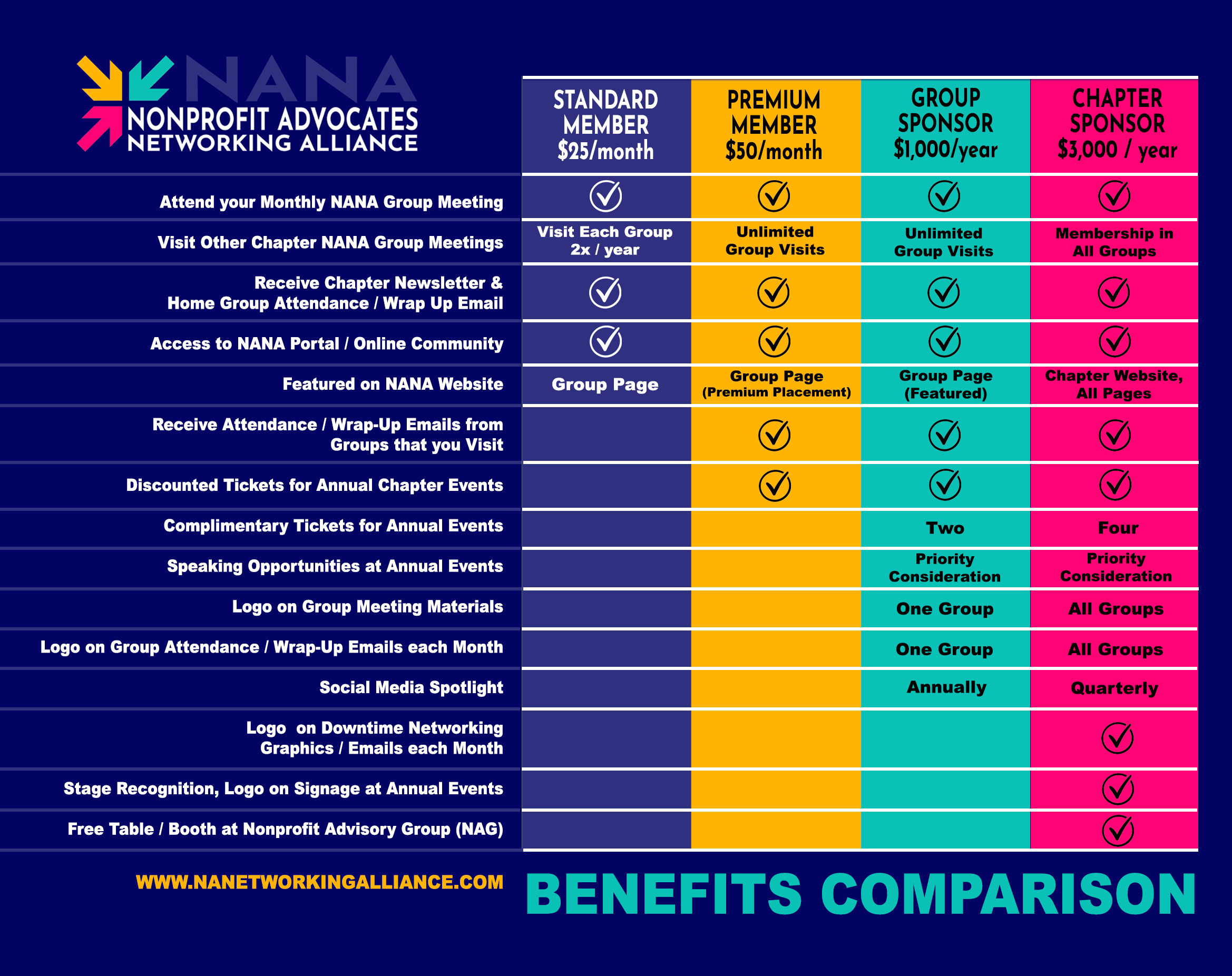 Starting at $25 per month, NANA membership is priced to be accessible to any professional who wants to participate — not just those with a corporate expense account or a generous employer. The low barrier is intentional. A NANA Group is most valuable when the room reflects the full breadth of the business community: the solo consultant alongside the regional bank VP, the independent contractor alongside the marketing director. Diverse professional perspectives make for better advisory conversations — and more interesting relationships.